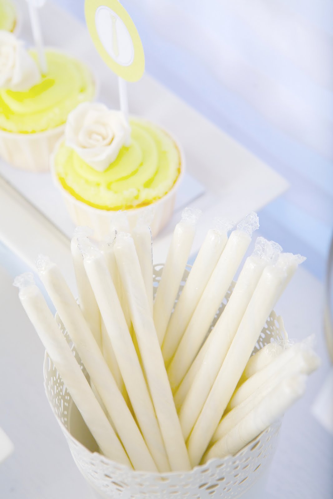 I went with a very light color pallet. Everything was white, really light green and really light blue. The dessert/sweets table was set up on a vintage dresser {that I painted white}. I used white and clear cake stands, platters and plates. I also incorporated eyelet into the mix. The printables {tags, labels, toppers, invite, banner, etc} were ordered from the sweet Kori of Paper And Pigtails. She was wonderful to work with and customized everything. This party could easily be a Christening party, a Baptism party, a baby shower, a 1st birthday party and more.