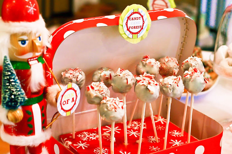 The main Brunch table consisted of traditional brunchy foods: savory mini quiches and roll ups, bagels and cream cheese, and lots of cakes and donuts! Being in the south, no table is complete without some Chick-fil-a Chicken Minis (which were the hit of the brunch). I wanted the brunch table to display Buddys journey from the North Pole to New York. Buddy passes through the Candy Cane Forest (the peppermint brownie cake pops) and through the sea of swirly twirly gumdrops (pastries with fondant gumdrops) then through the Lincoln Tunnel (the chocolate covered oreo tunnel).
