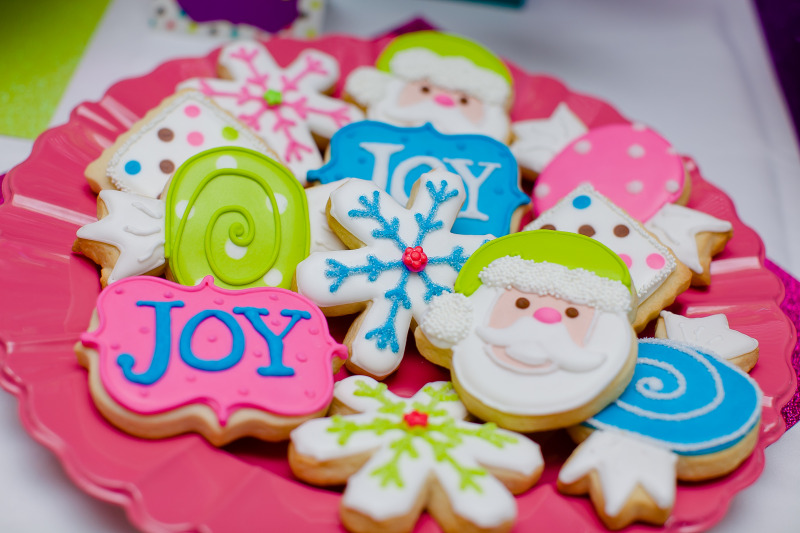 Here is what Michelle said about the party- “First, the main dessert table. My husband and I spray painted a fake wreath we bought at 40% off at Hobby Lobby a lime green color to keep with the theme. I then wrapped ribbon around it and added some matching picks to the wreath that ended up being a main focal point to the fabric backdrop. My hubby also spray painted glass candlestick holders from the dollar store that I used as accents to hold large ornaments. Spray painting stuff goes a LONG way! You would be amazed at all you can do with one little can :) All of the sweets were just amazing – custom cookies from The Cookie Jar, fondant cupcake toppers from Lynlee’s Petite Cakes, chocolate covered oreos by Sweeties, Santa Hat Cake Pops by Lillycakes and the beautiful fondant cake made by a local gal, Brianna Weichel. Oh and I just LOVE LOVE LOVE the pink cake stand from Danielle of OliviaDru on etsy! I made the snowman donuts inspired by a photo I saw on Pinterest and also dipped marshmallows in white chocolate and added some colorful sprinkles :)