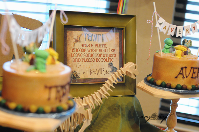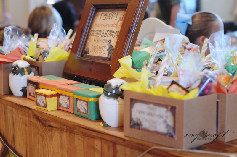 Each child got to go home with their own miniture dino dig and the dino in the egg cup. (by far my favorite decor). The nest in the middle of the childrens table was one package of different types of moss from Hobby Lobby. Also purchase there was my fabric, ribbon, and frames, all on sale! I wanted my children involved in the creation so they painted the backdrop behind the childrens table (with just a little help from me in the end…) I also created and printed the subway art for the backdrop. I chose not to put anything to do with birthday on it because I wanted to hang it in their room! The frame… $7 at Hobby Lobby! Oh Yeah! I sanded the edges to make it more rustic!
