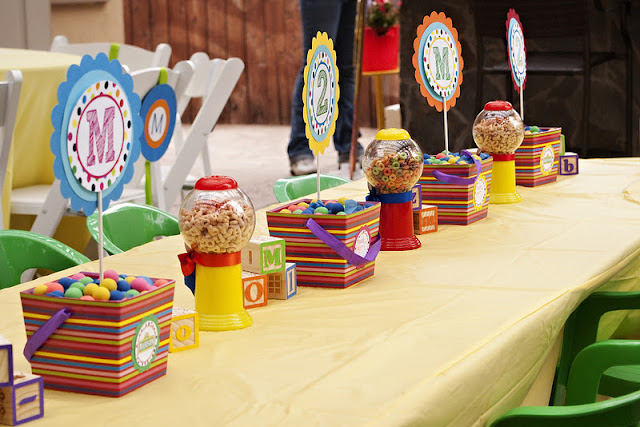 *The kids table was a favorite element it featured brightly colored gumball machines filled with kid friendly snacks like puffs, fruit snacks and cheerios that kids could dispense themselves into brightly colored candy cups. Alphabet blocks were also scattered across the table for fun during mealtime!