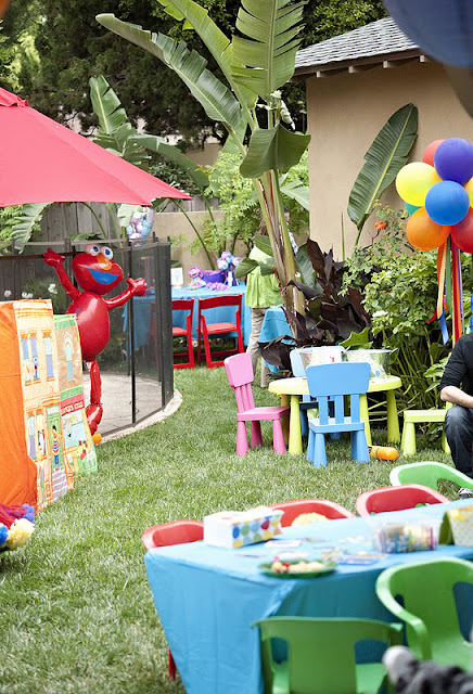 *A giant elmo prop (5 feet tall!!) was the centerpiece of the backyard and was flanked by multicolored balloon bouquets-ACTIVITIES: