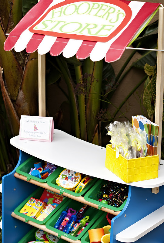 *Mr. Hoopers Store (This was Madisons favorite element of the party!! We customized a Melissa & Doug lemonade stand to turn it into Hoopers Store. The shelves were stocked with kid favorites like bouncy balls, mini tambourines, crayons and coloring books. Every child got a pouch of play money so they could buy all of their favorite treats and place them in custom Mr. Hoopers store shopping bags!)